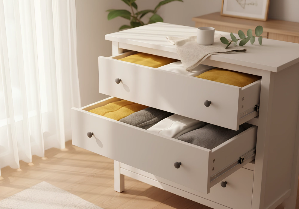 Wenn du schon deine Schränke leer räumst, dann halte gleich einen feuchten Lappen bereit, mit dem du einmal durch die Schränke feudelst. Dann können die Sachen ordentlich wieder in eine saubere Umgebung geräumt werden – und sauber alles sieht direkt freundlicher aus.
