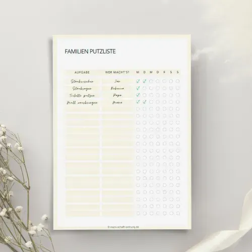 Hol dir die Vorlage, damit die Aufgaben auf alle Familienmitglieder verteilt sind. Ausdrucken, an den Kühlschrank hängen, Abhaken. Jeder weiß, was zu tun ist - ganz ohne endlose Diskussionen. So wird Ordnung im Alltag zur Teamarbeit (und du bist nicht mehr die alleinige Aufräum-Chefin).